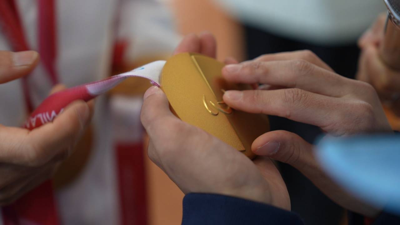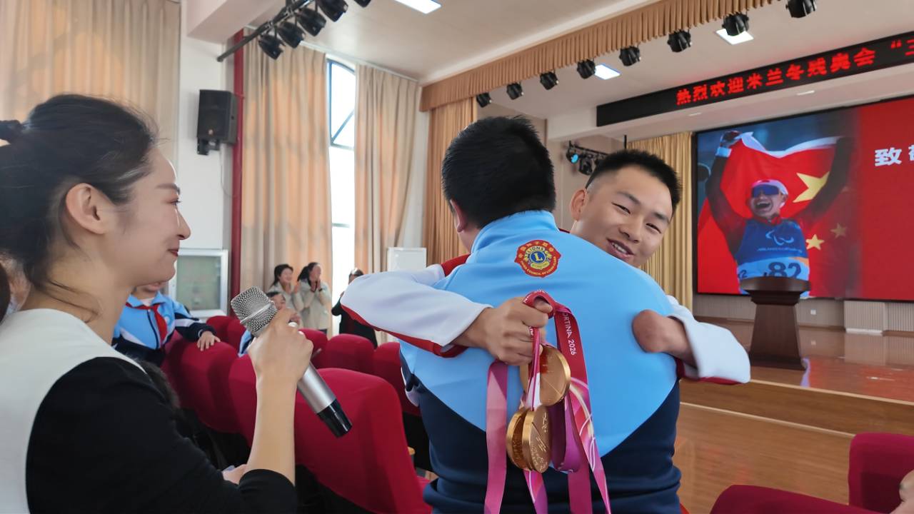 “能见到世界冠军十分震撼兴奋,我从蔡佳云哥哥身上深刻理解了坚持的意义。”八年级学生田恒炳感慨道。听障学生余洁也用手语坚定表达,要以蔡佳云为榜样,努力奋进、不负韶华。宣讲结束后,孩子们纷纷上前与蔡佳云拥抱合影,亲手触摸一枚枚沉甸甸的金牌,榜样的力量在指尖与心间真实可感。