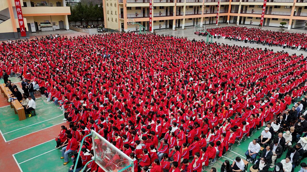 宣讲还未开始,空气中便已弥漫着躁动的热气。当蔡佳云出现的那一刻,全场瞬间沸腾。他身着一件红色运动服,这抹红色与学生们校服的红色融为一体,一时难分彼此。