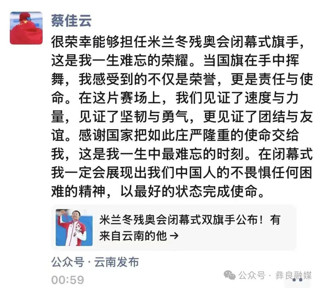 对于担任闭幕式旗手这一荣誉,蔡佳云表示:“很荣幸能够担任米兰冬残奥会闭幕式旗手,这是我一生难忘的荣耀。当国旗在手中挥舞,我感受到的不仅是荣誉,更是责任与使命。在这片赛场上,我们见证了速度与力量,见证了坚韧与勇气,更见证了团结与友谊。感谢国家把如此庄严隆重的使命交给我,这是我一生中最难忘的时刻。在闭幕式我一定会展现出我们中国人的不畏惧任何困难的精神,以最好的状态完成使命。”