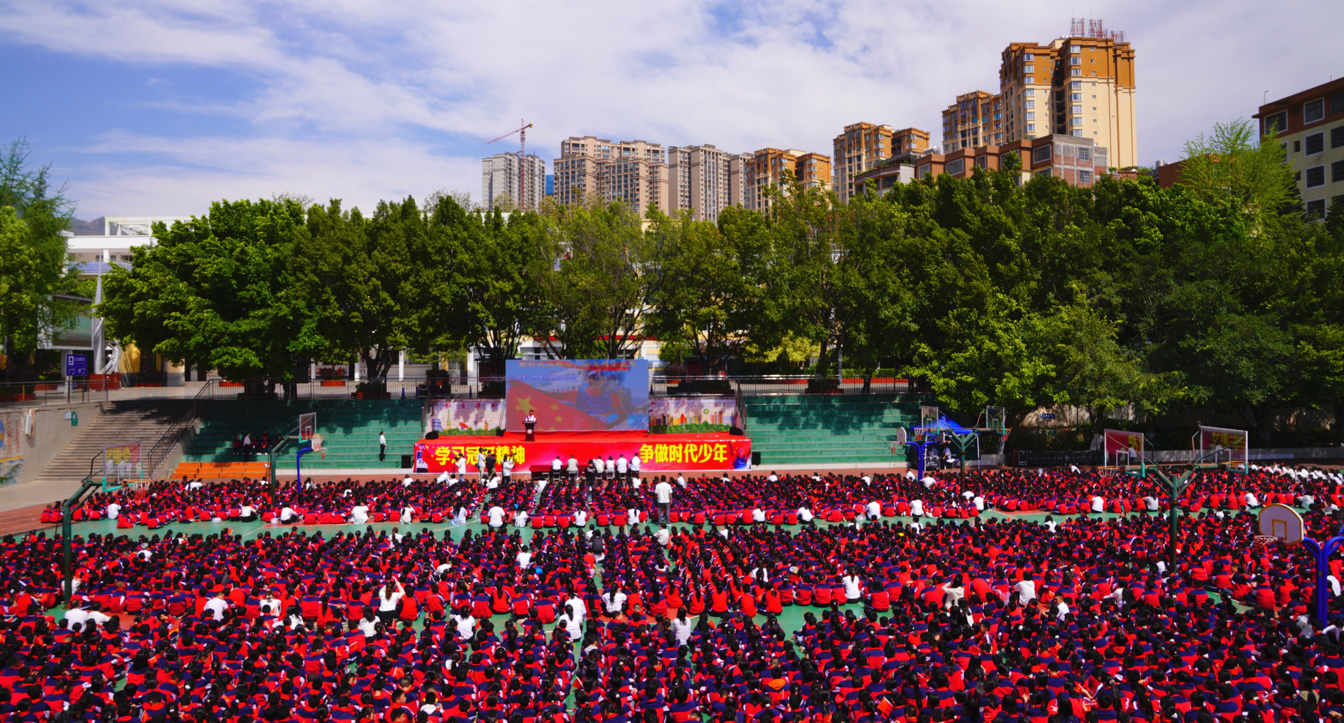 互动结束后,全体学生齐声朗诵《少年中国说》,铿锵有力的朗诵声回荡在校园上空,充分展现出彝良学子朝气蓬勃、奋发向上的精神风貌。活动最后,全体师生共同合唱《歌唱祖国》,嘹亮的歌声饱含着对祖国的热爱与祝福,将现场氛围推向高潮。