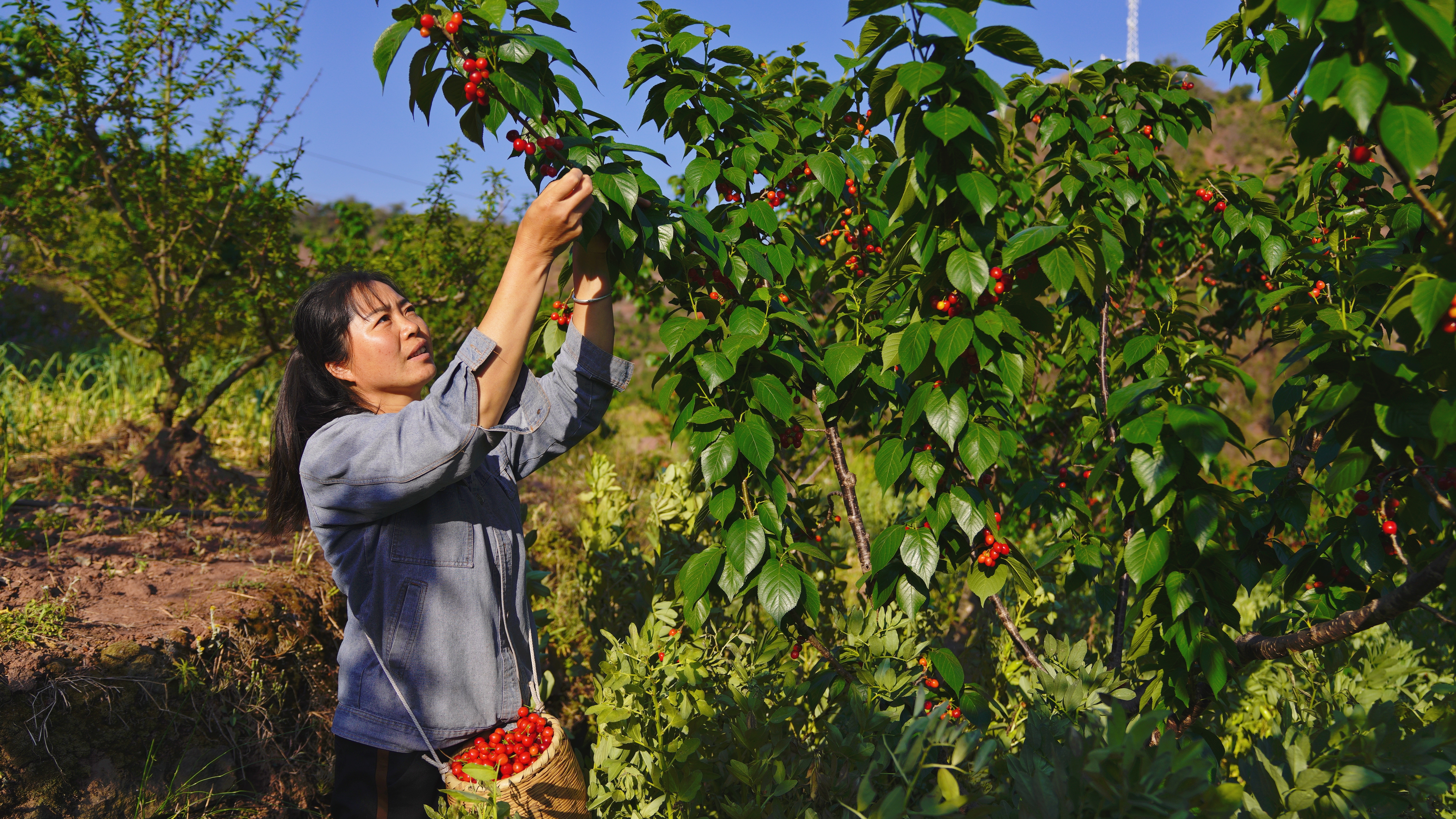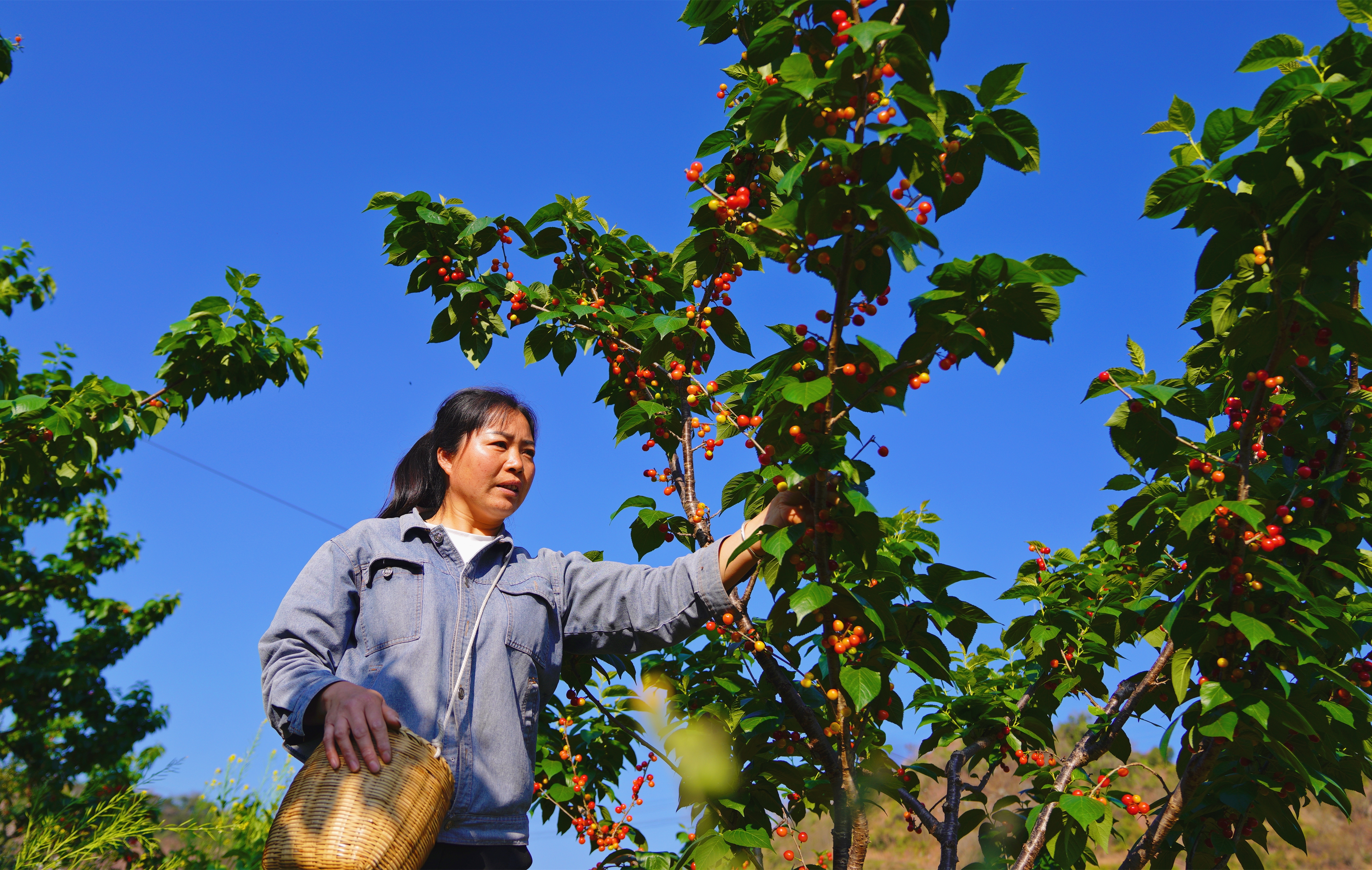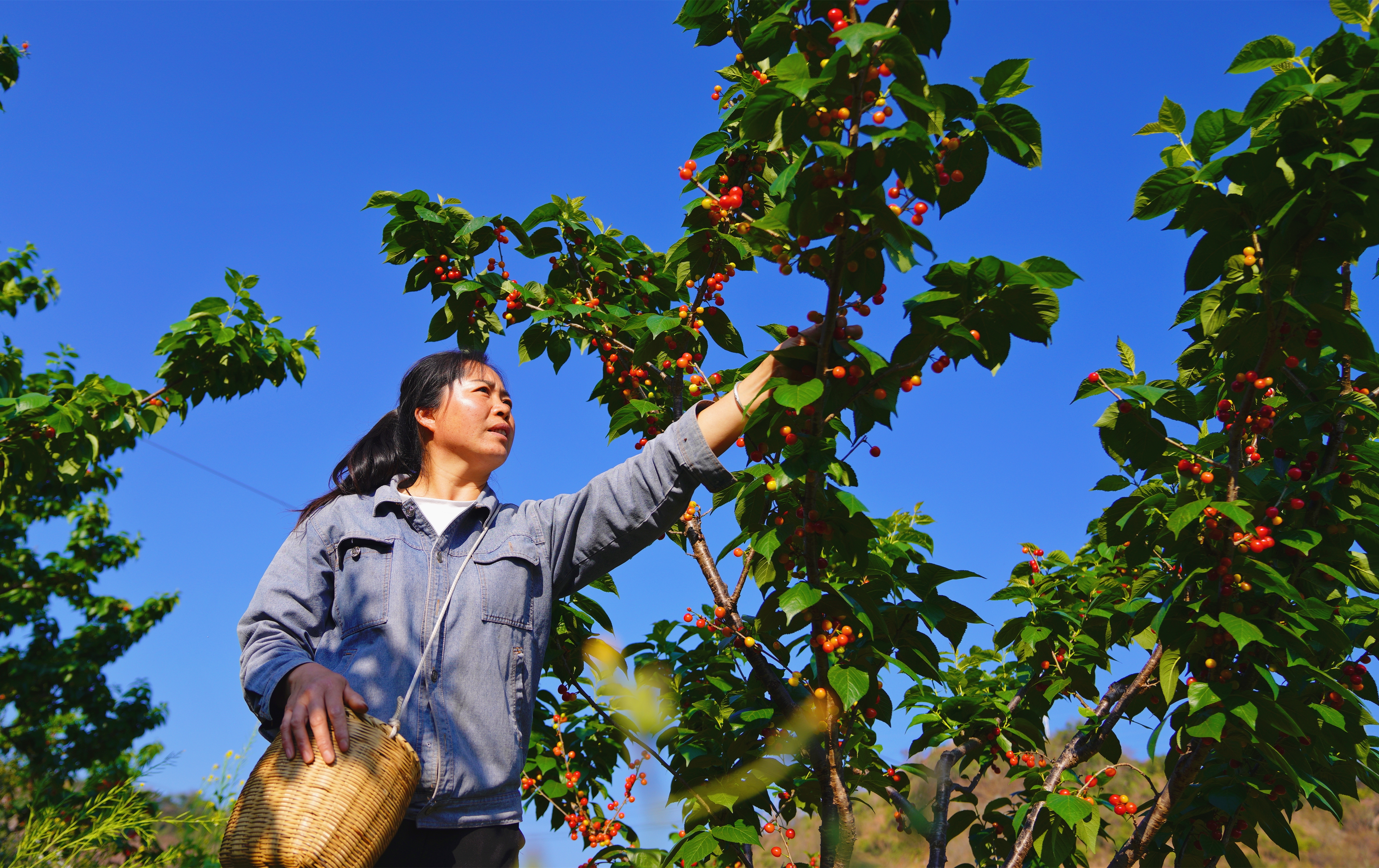 4月9日,彝良县角奎街道漆树村下寨组村民正在采摘樱桃。