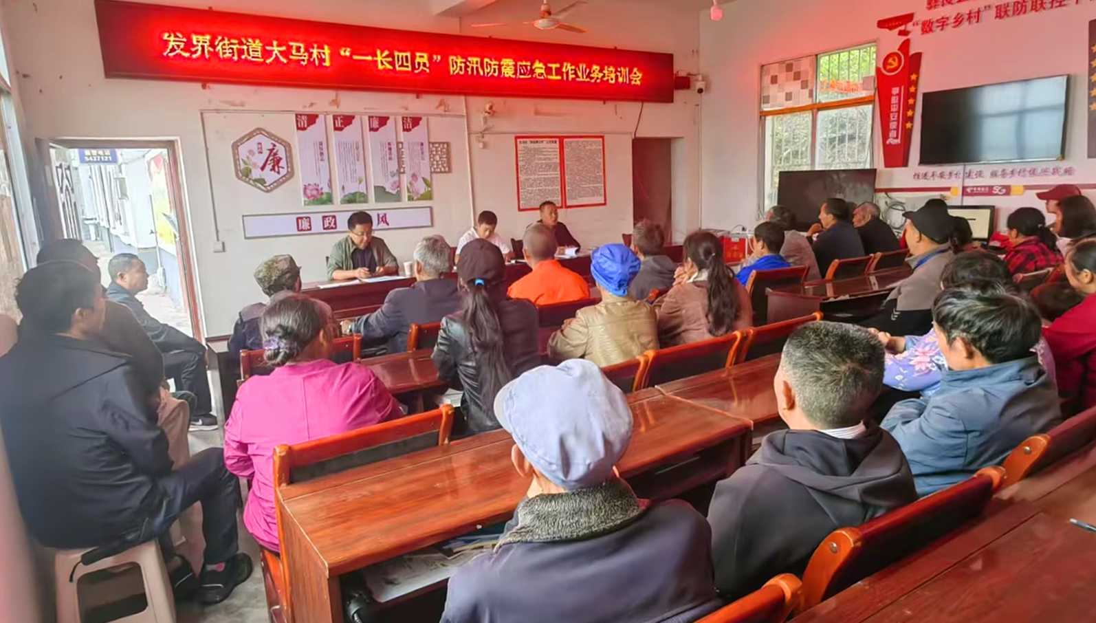此次培训坚持“理论+实操”相结合的原则,紧密结合大马村地形地貌、隐患分布、汛期特点等实际情况,重点围绕防汛、防震两大核心内容开展系统授课。在防汛业务培训中,授课人员聚焦实战,系统讲解汛前隐患排查要点、汛期雨情水情监测方法、河道沟渠日常巡查重点、洪涝灾害避险转移流程以及灾情信息报送规范等关键内容,确保参训人员全面掌握防汛工作各环节核心要求;在防震减灾培训中,详细解读地震基础知识、宏观异常观测技巧、震前防范措施、震时科学避险方法、震后自救互救流程及应急疏散组织要点,层层拆解应急处置细节,让参训人员清晰掌握每一项实操技能。