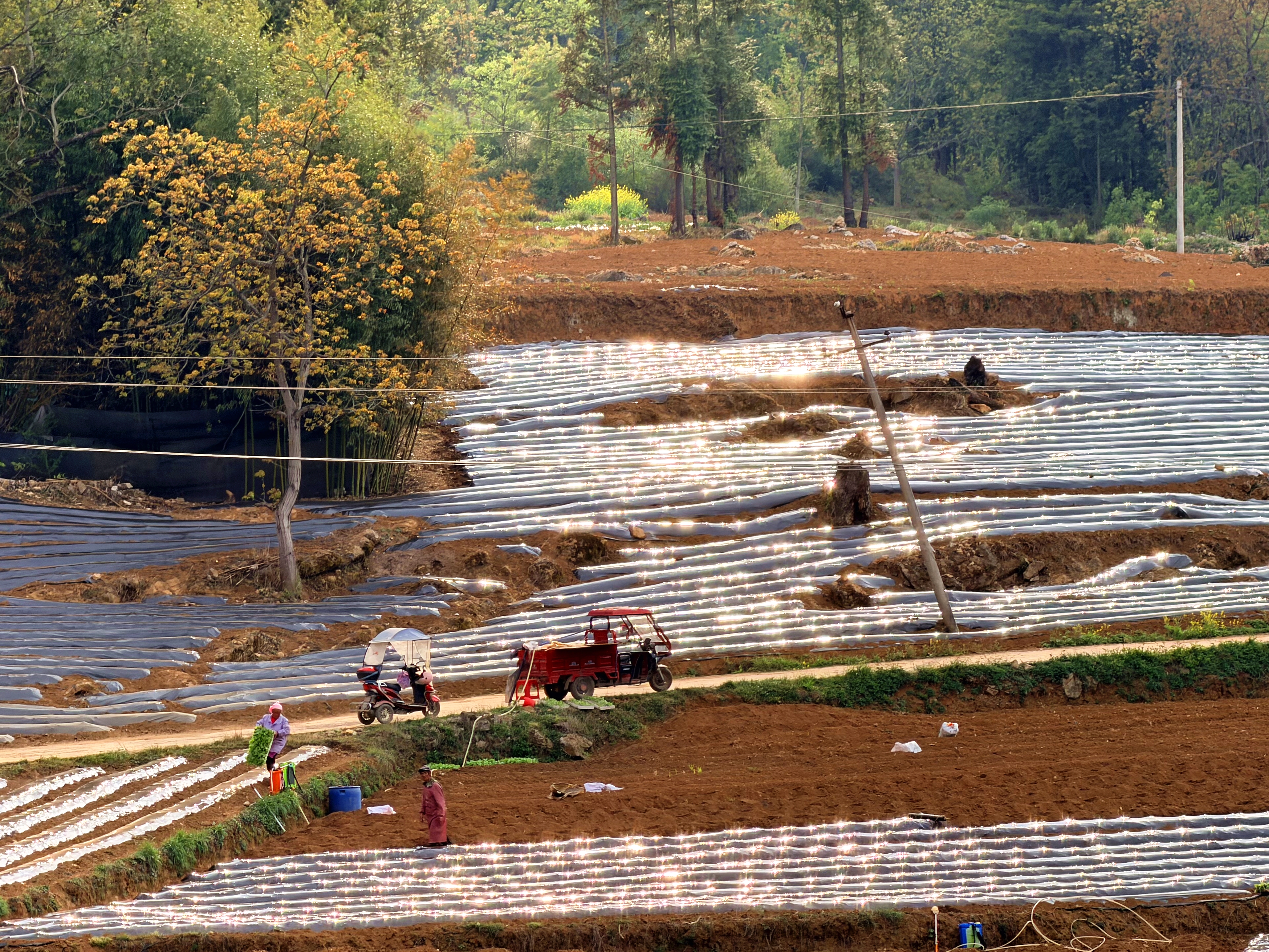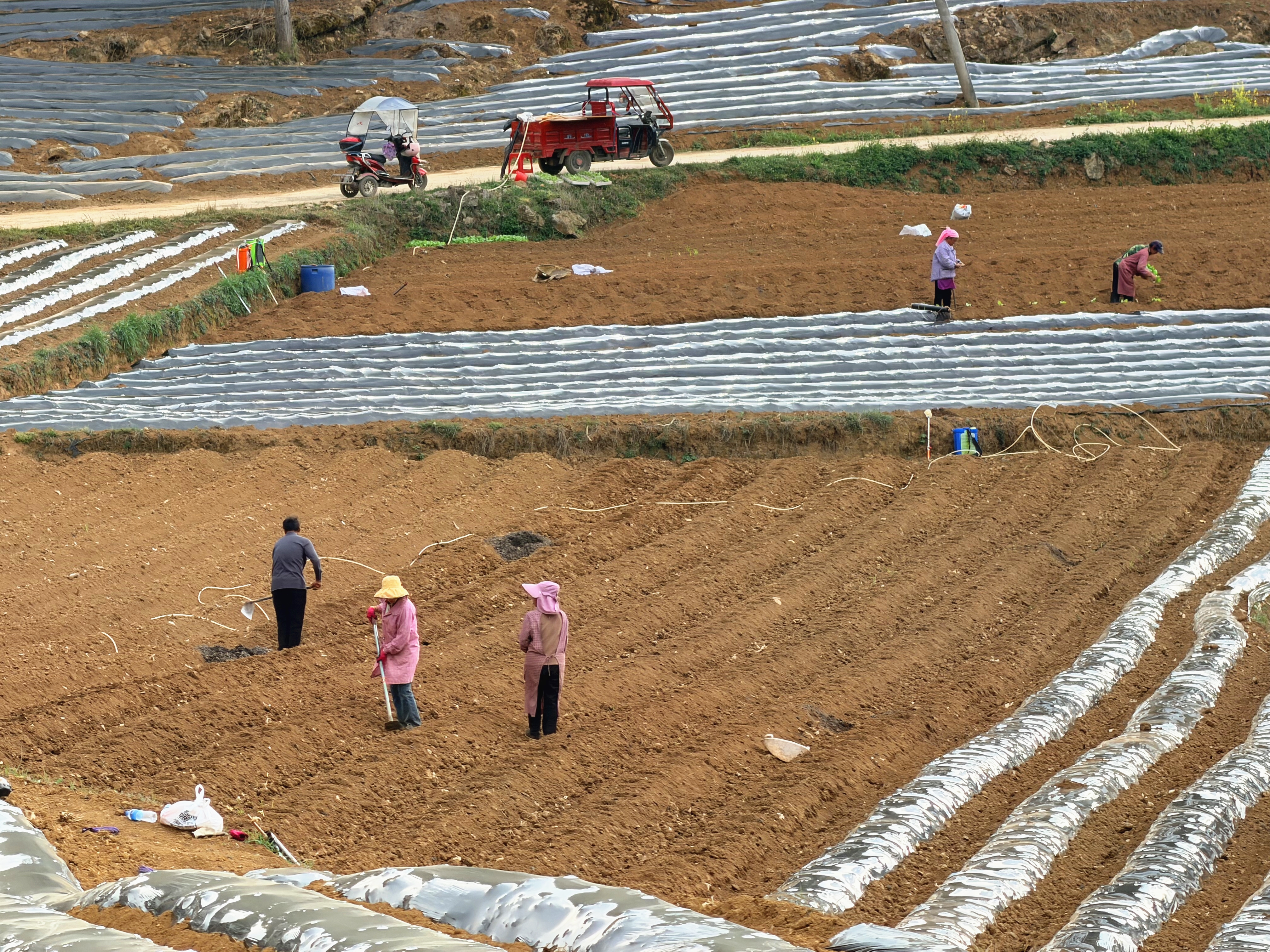 在尖山村瓦房组的烟田里,一派热火朝天的劳作景象扑面而来。一垄垄规整饱满的烟墒顺着山坡地势蜿蜒延伸,与春日暖阳交相辉映,焕发出勃勃生机。烟农们三五成群、分工协作,施肥、覆膜、放苗、栽苗、浇水,每一道工序都娴熟利落、有条不紊。指尖翻飞间,一株株嫩绿的烟苗被稳稳栽入地垄,浇上定根水,一排排、一行行,在田埂间勾勒出希望的轮廓。